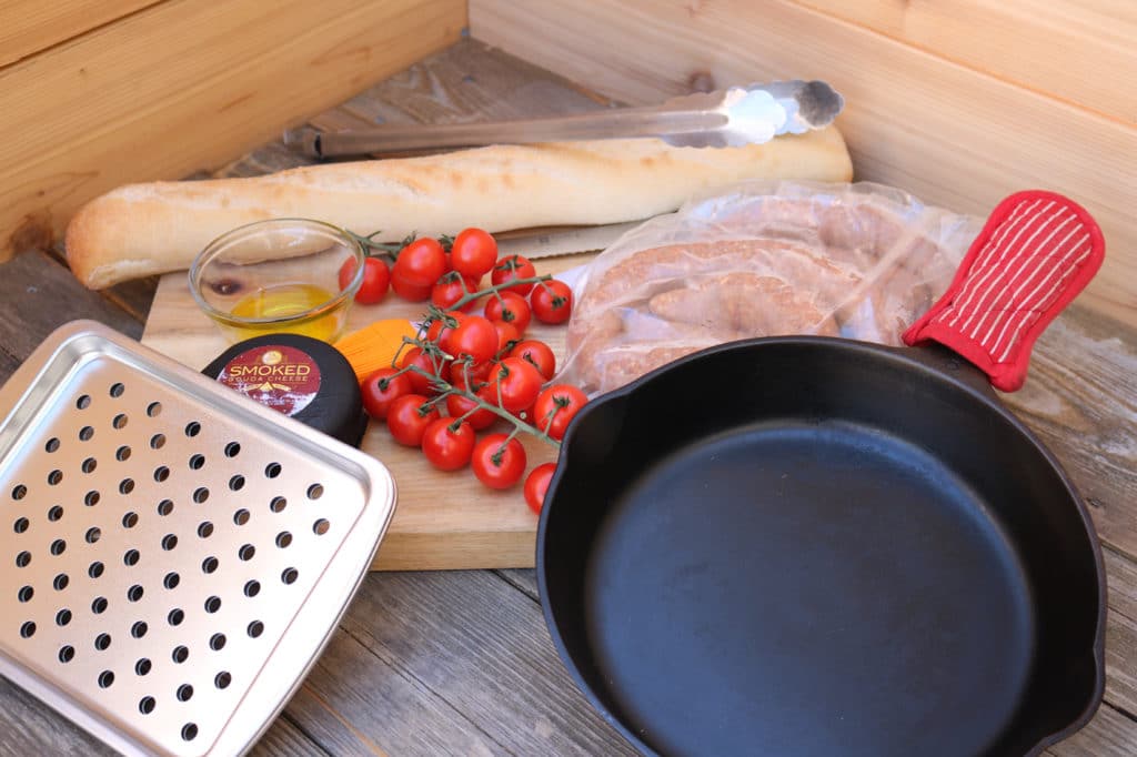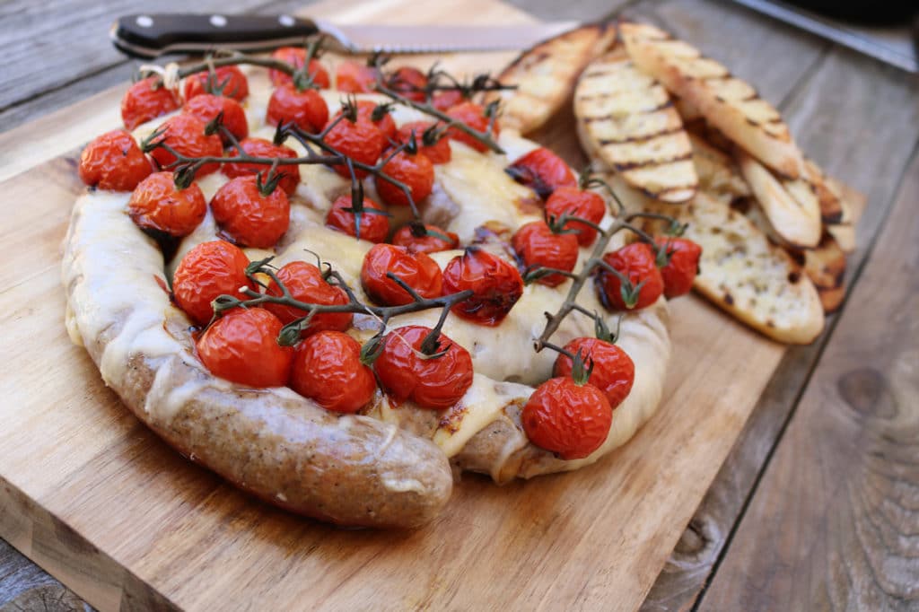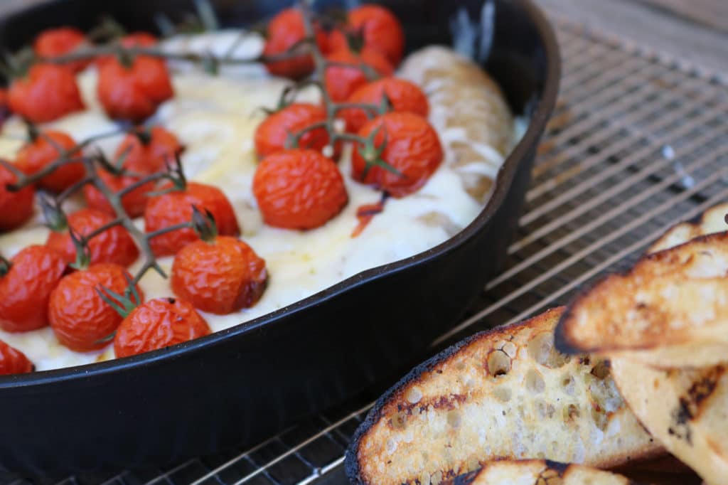- Move cast iron skillet over direct heat and sprinkle sausage with the grated Gouda cheese. Once sausage reaches an internal temperature of 155-160 degrees F., remove from direct heat and garnish with the blistered tomatoes. Slice and serve with the grilled Baguette slivers.